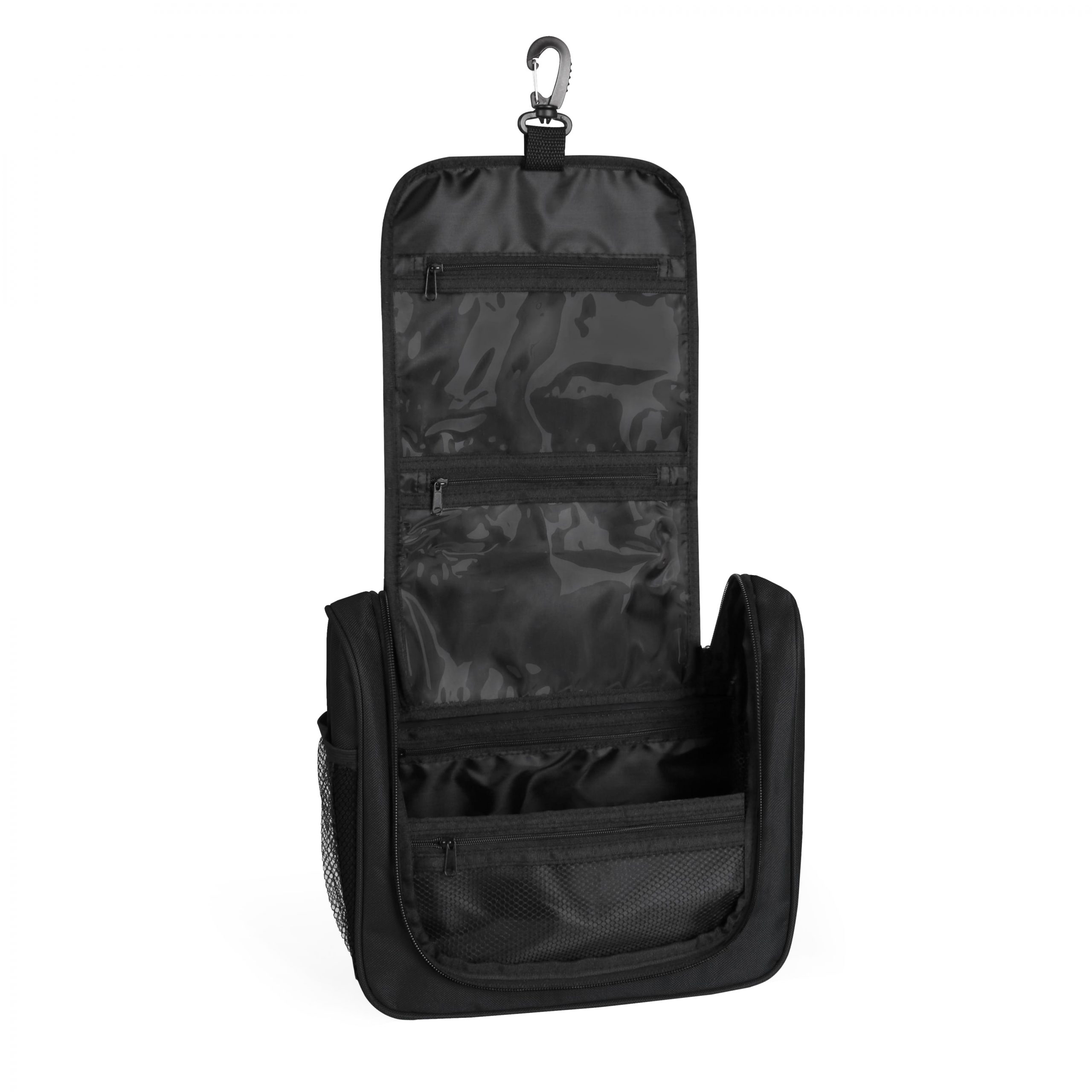 Компактна косметичка з ручкою та карабіном, велике відділення на блискавці, має внутрішні розділювачі-фіксатори на резинці, різні кишені з сітки, тканини, та щільного прозорого поліетилену на блискавці. Зовнішня кишеня на блискавці та бокова кишеня із сітки. Тканина: поліестер 600Х300D/PVC. Розмір: 26 х 34 х 10 см. Метод нанесення: шовкодрук, тремотрансфер.