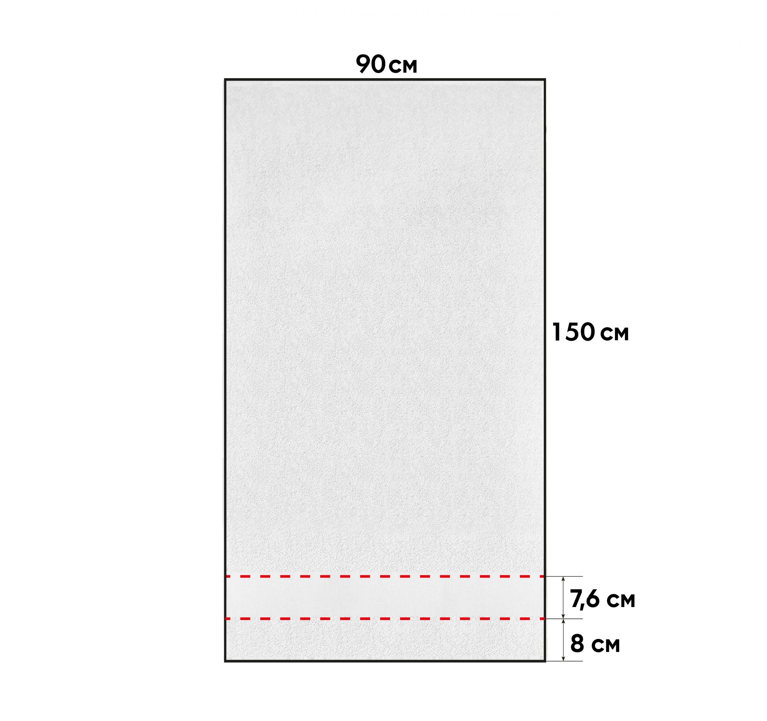 Рушник 100% бавовна, щільність 600 г/м2., розмір 150 х 90 см. Кількість у ящику 20 шт., індивідуальна упаковка, поліетиленовий пакет. Подвійна стрічка на загибі, функціональна петля. По одному краю рушника є гладкий бордюр для нанесення логотипу, ширина бордюра 7,6 см.