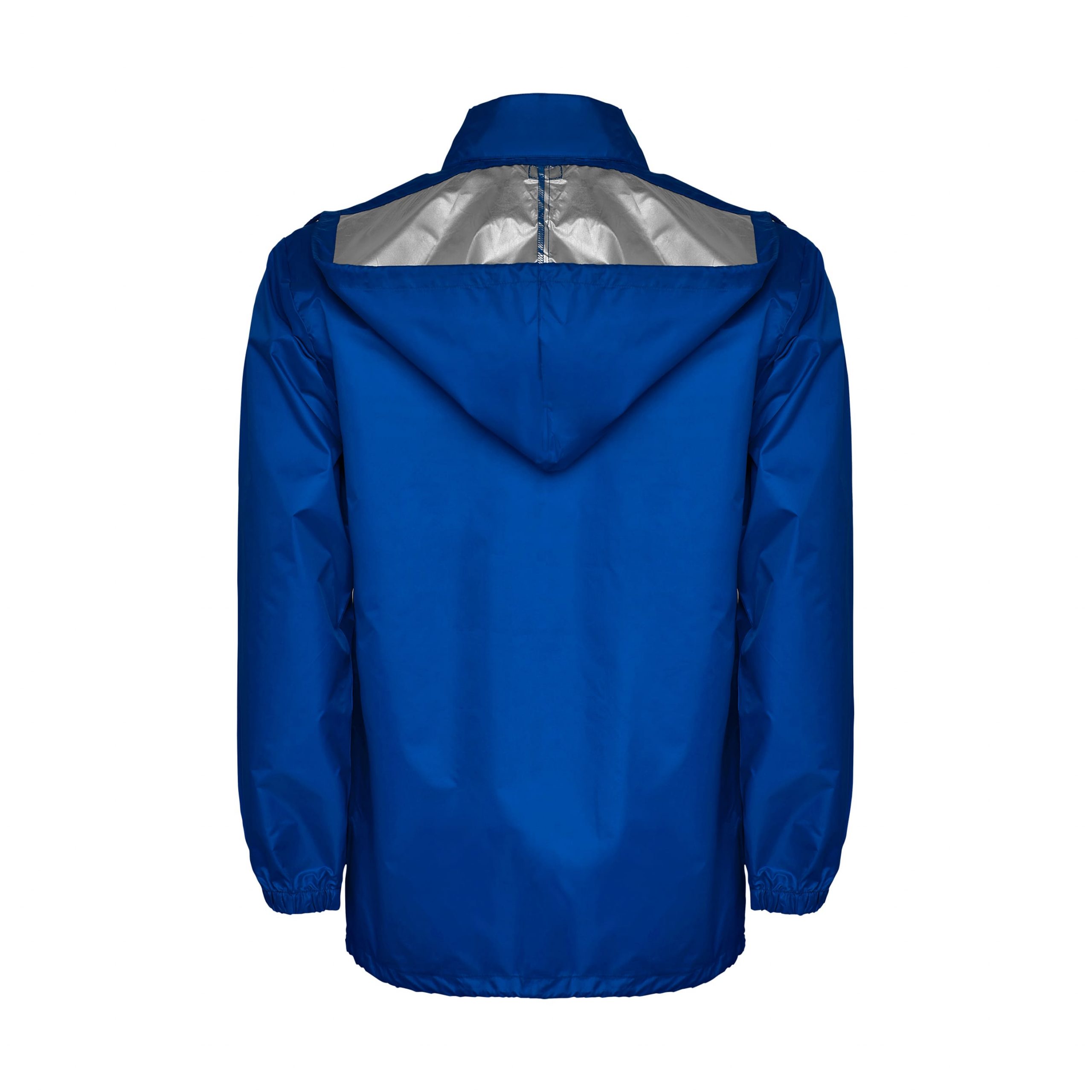 Водонепроникний плащ з високою горловина і складним капюшон. Міцний матеріал з полімерних волокон із захисним просоченням, який не вбирає вологу. Має регулювальний шнурок. Передня блискавка з відповідним знімачем. Дві бічні кишені з клапанами. Еластичні манжети. Еластичний ремінь всередині кишені для складання та зберігання. Матеріал: 100% водонепроникний поліестер, сріблясте покриття, 70 г/кв.м.